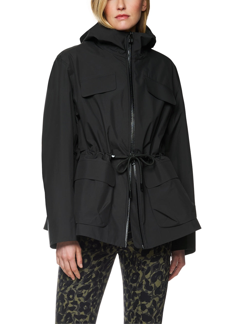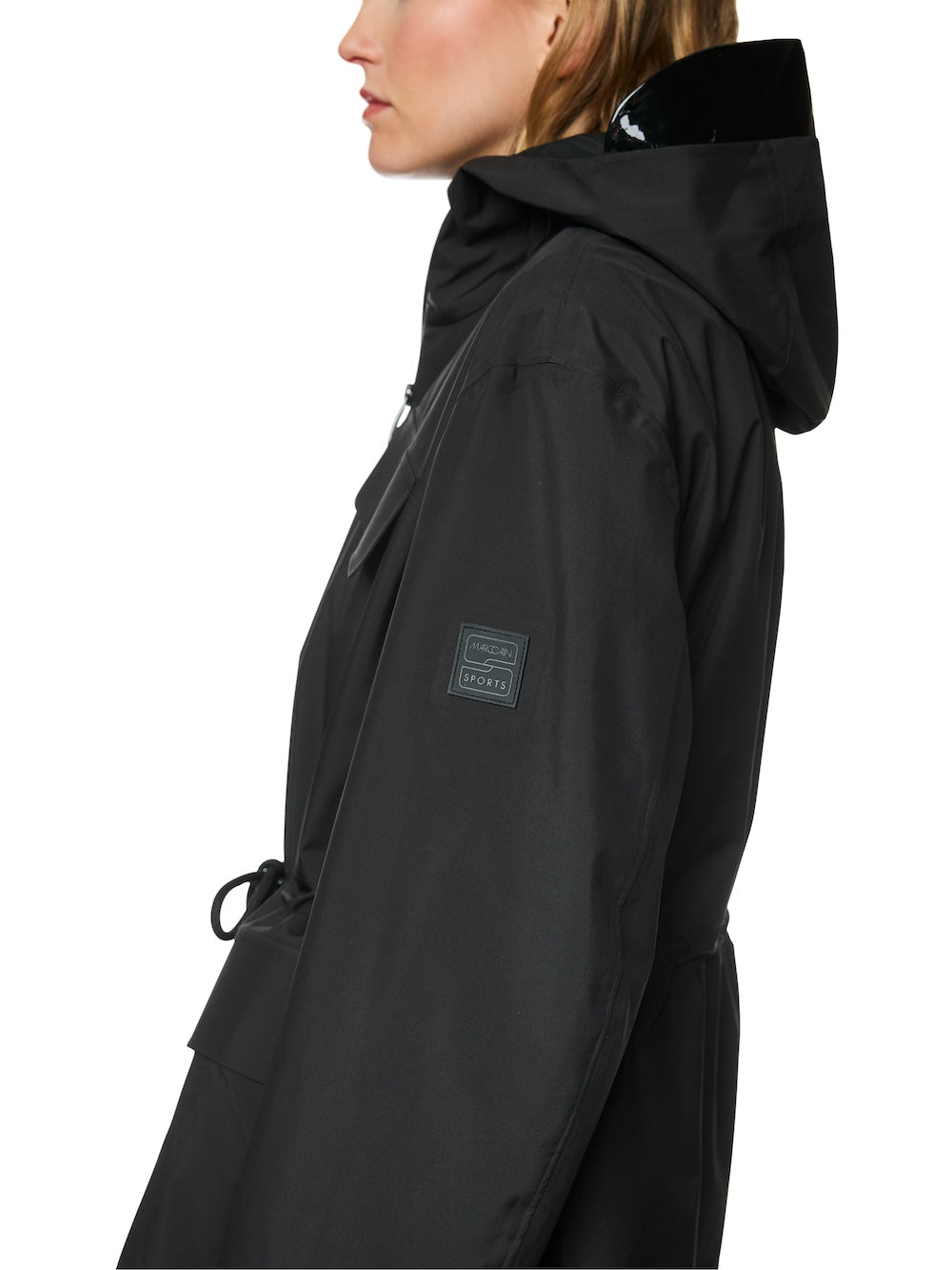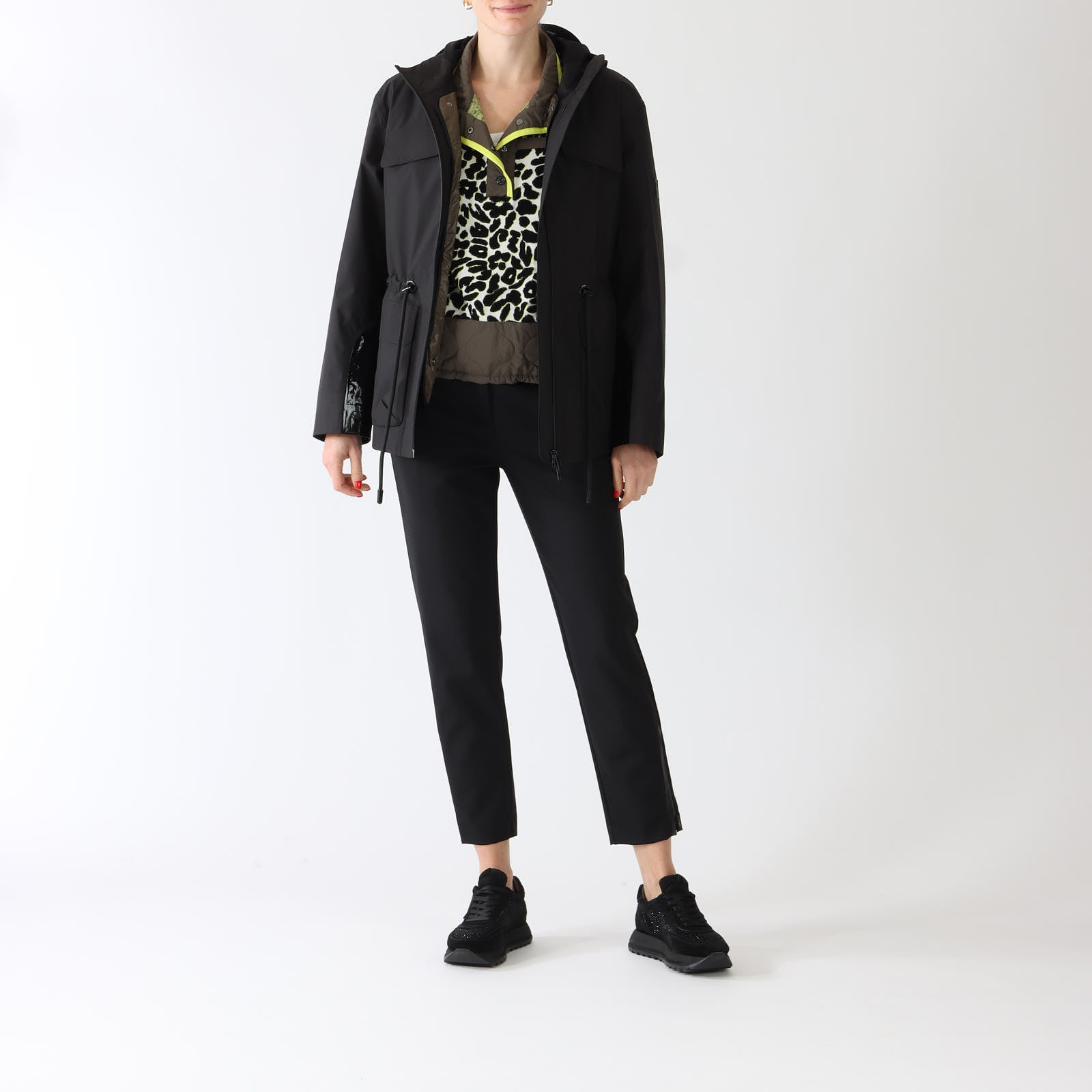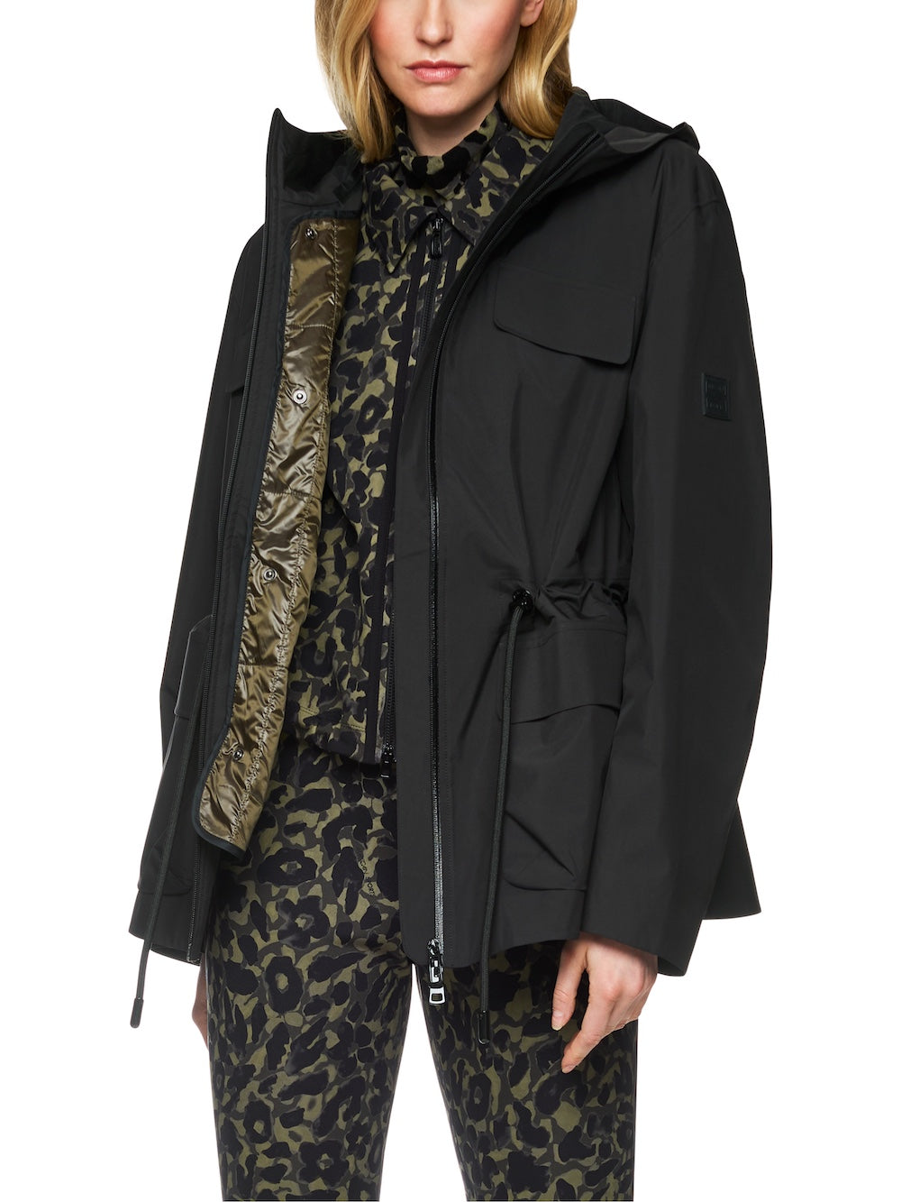 Your new staple coat is the Black Hooded Utility Jacket With Drawstring by Marc Cain Sports. This utility-style jacket has a high collar with a peaked hood, large pockets and a zip fastener. Its straight cut can be adjusted at the waist with a drawstring. Its highlight is the removable softshell inner jacket in a contrasting colour – making it ideal for all weather conditions.