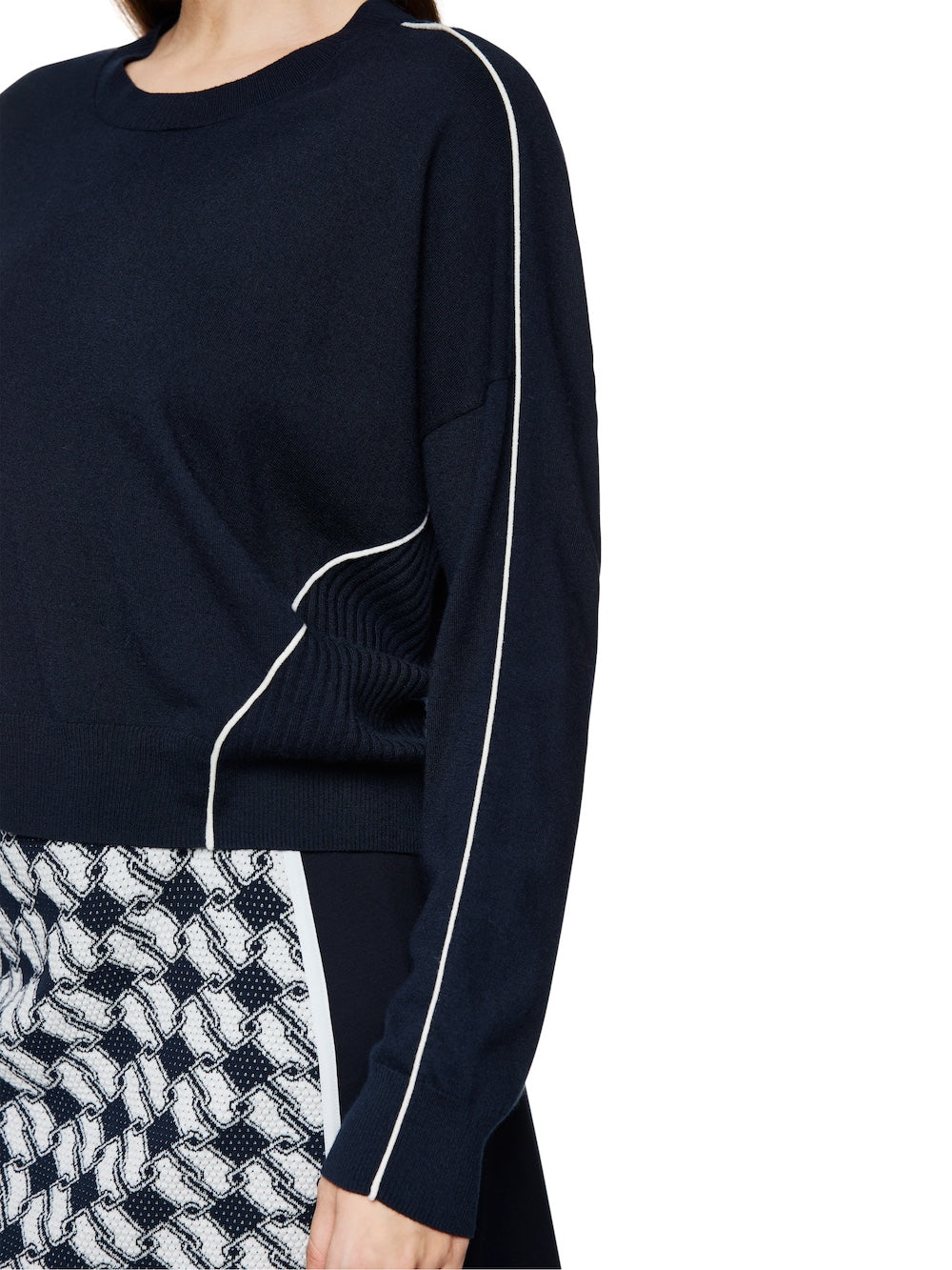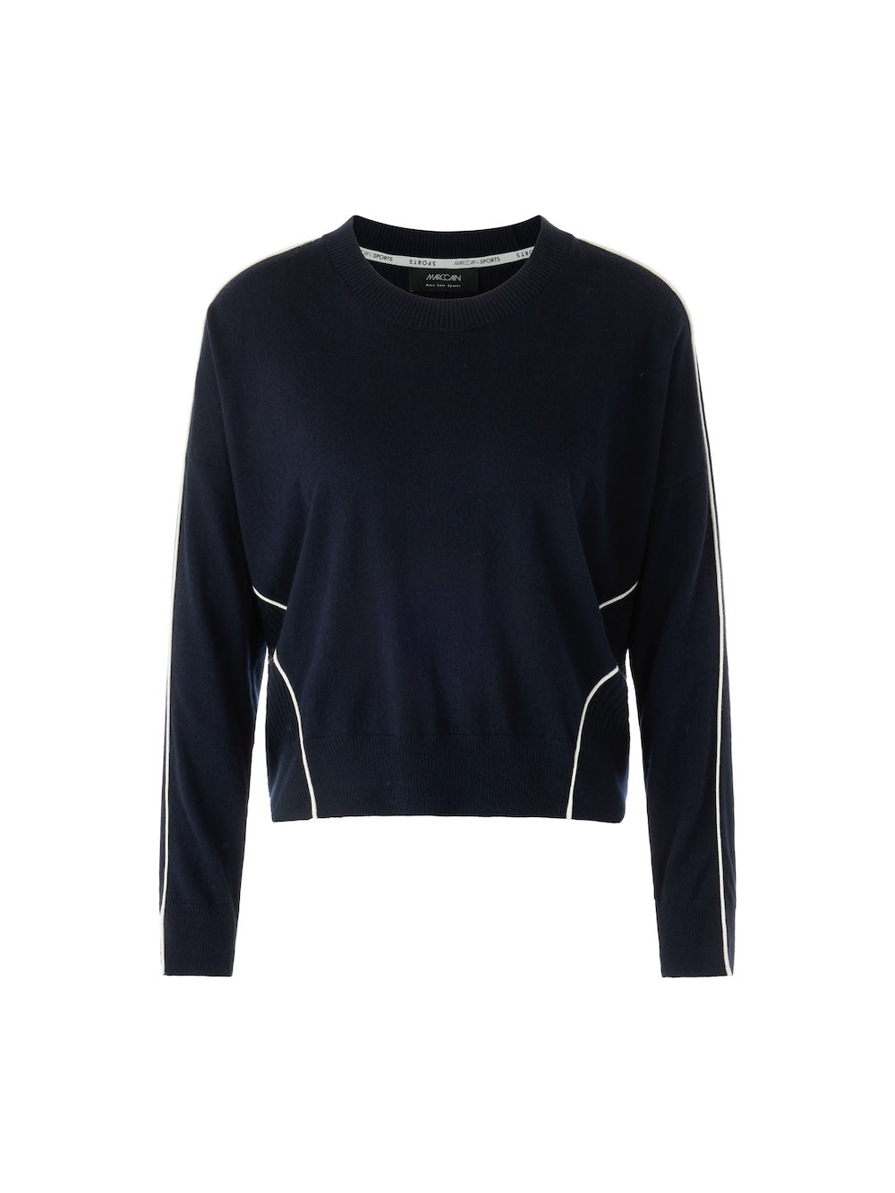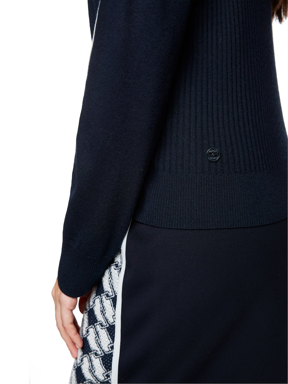 Experience ultimate comfort and style with Marc Cain Sports Navy Wool Blend Sweater. This stylish sweater features contrast white piped trims and a high round neckline for a modern twist on a classic look. The ribbed knit trims and back add a touch of texture, while the long sleeves provide warmth. Elevate your wardrobe with this must-have piece!