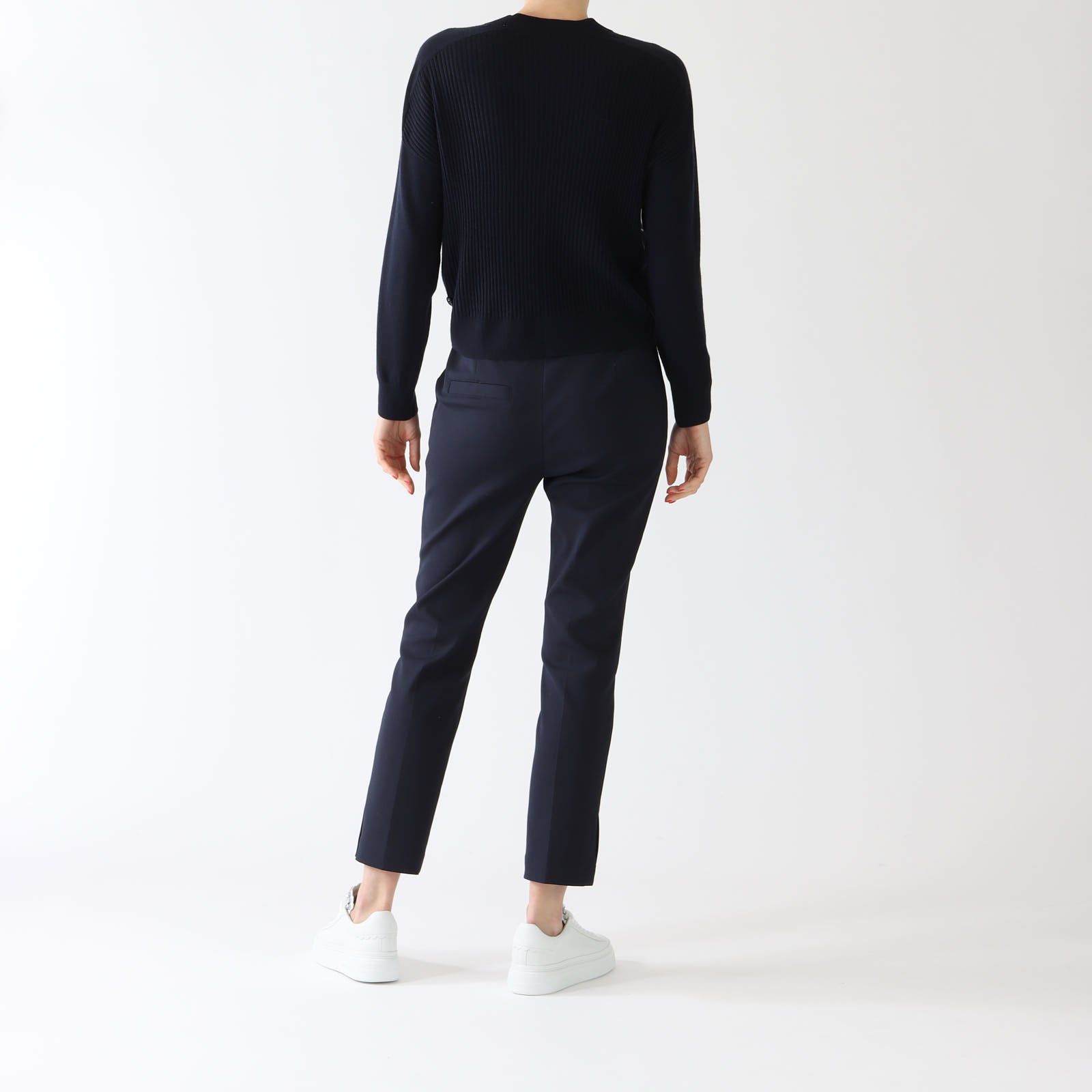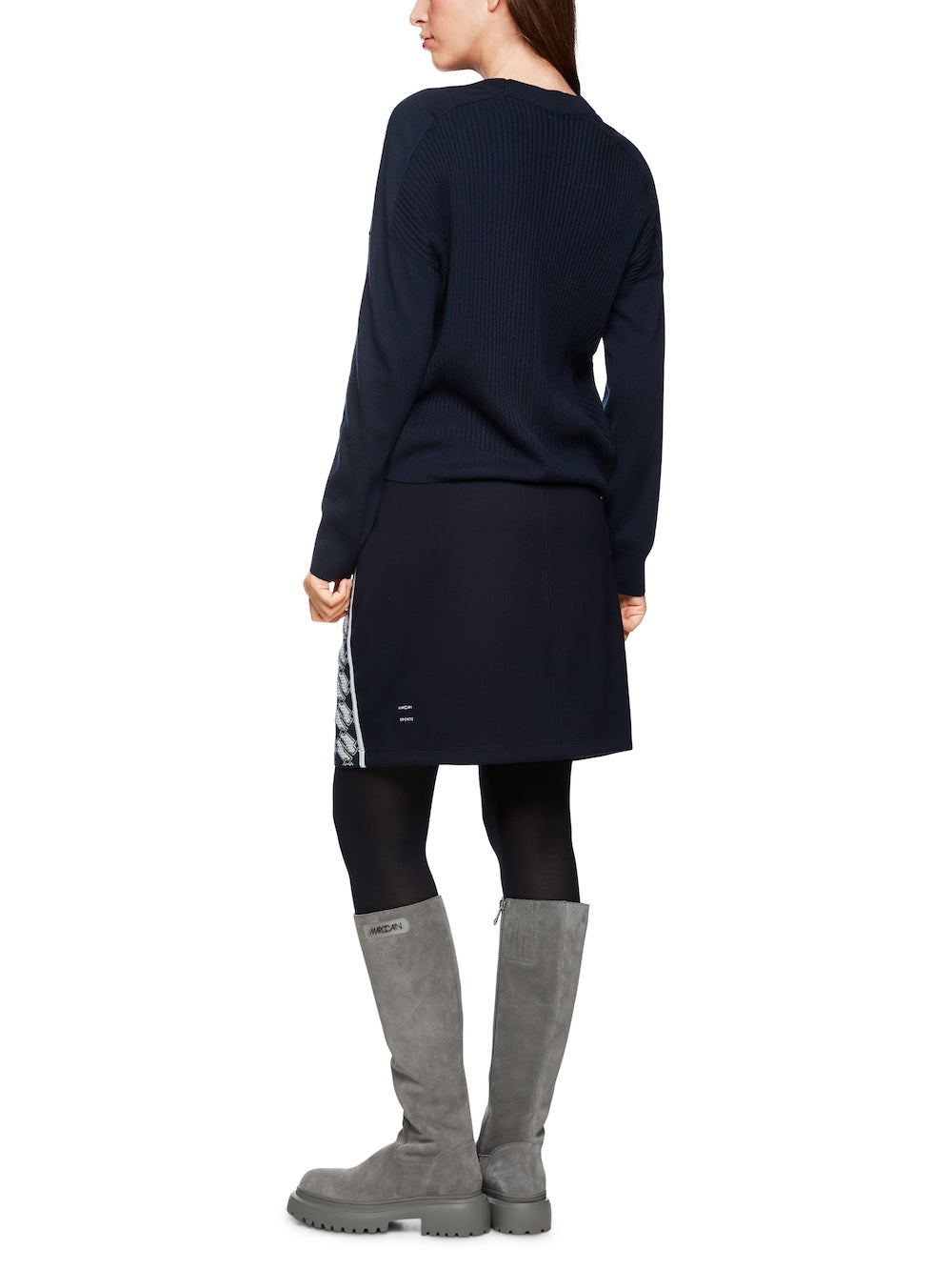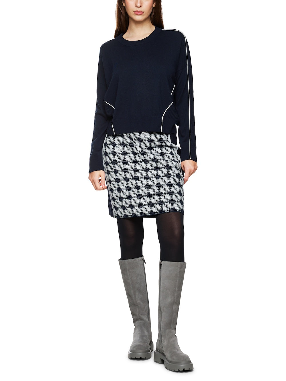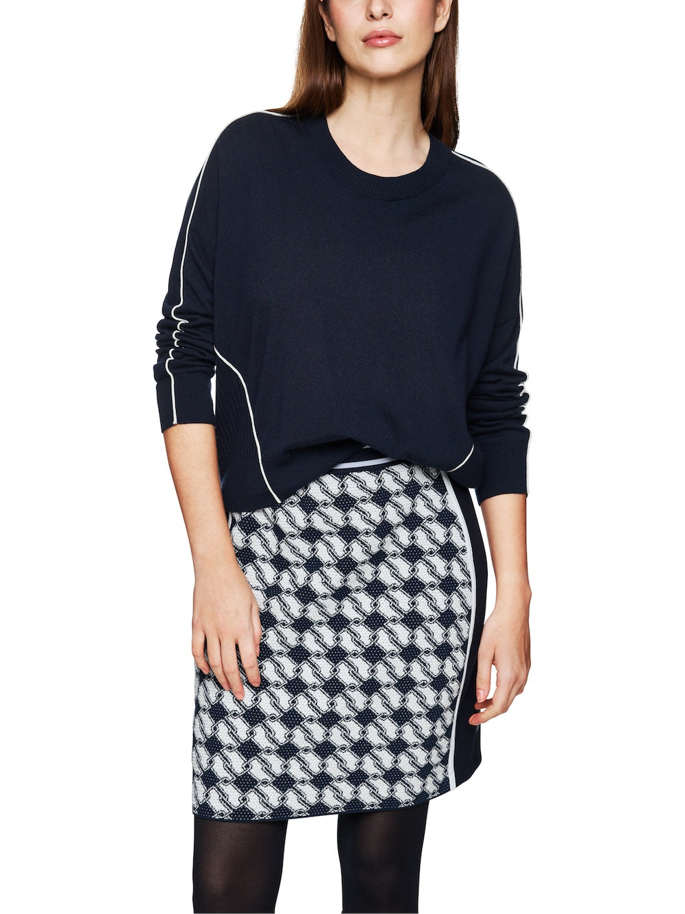 Experience ultimate comfort and style with Marc Cain Sports Navy Wool Blend Sweater. This stylish sweater features contrast white piped trims and a high round neckline for a modern twist on a classic look. The ribbed knit trims and back add a touch of texture, while the long sleeves provide warmth. Elevate your wardrobe with this must-have piece!